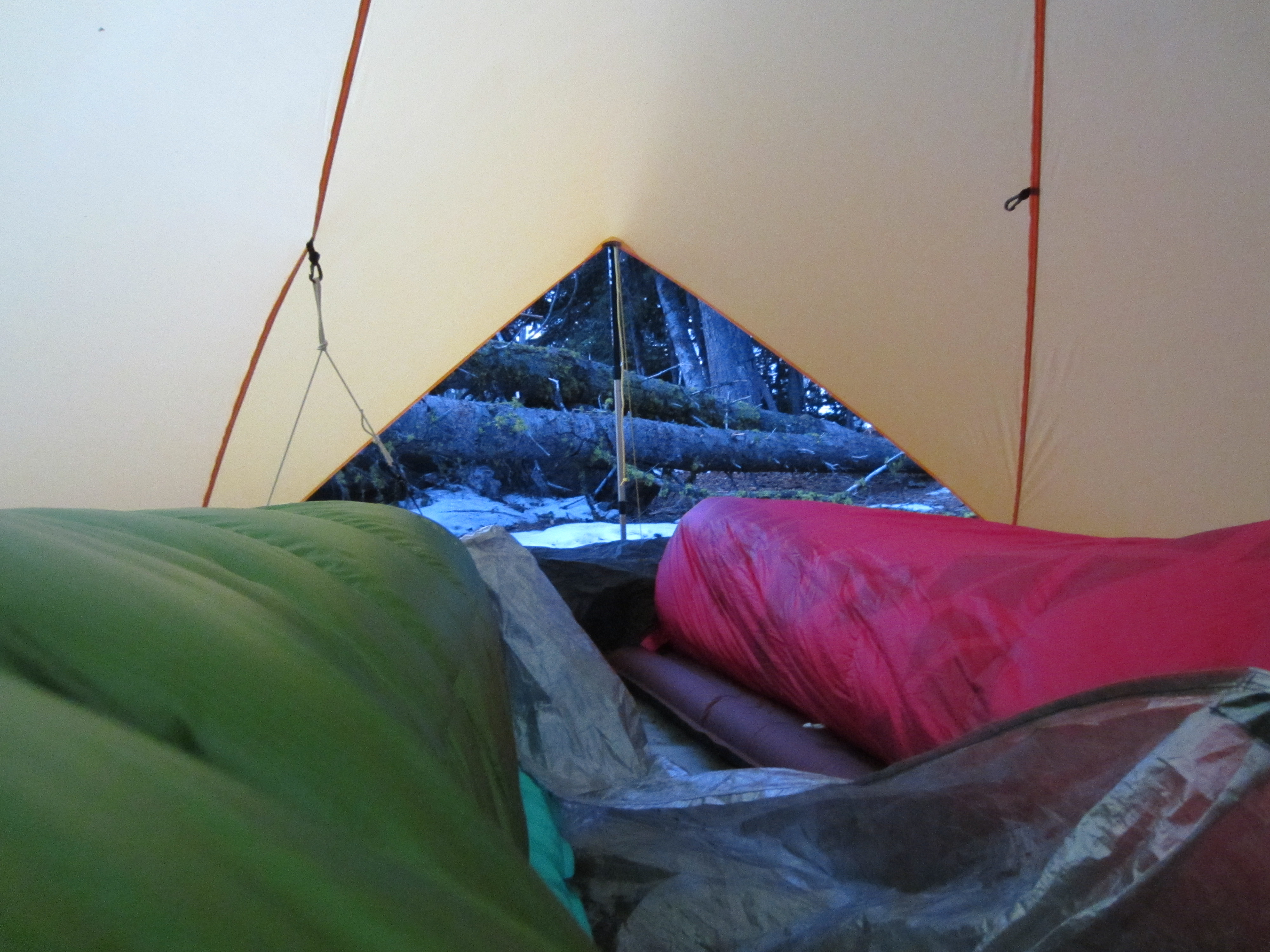 After hanging our food for the night (we had seen bear tracks in the snow on the way up and mountain lion tracks in the snow on the other side of the lake we were camping at) we boiled some water and put it in our Nalgene bottles. I was actually too warm at first (rare for me) in my sleeping bag with 3 cups of 200 degree water. The full moon coupled with the snow and the bright yellow/orange Trailstar made for a very bright night. We slept in late and stayed warm all night.