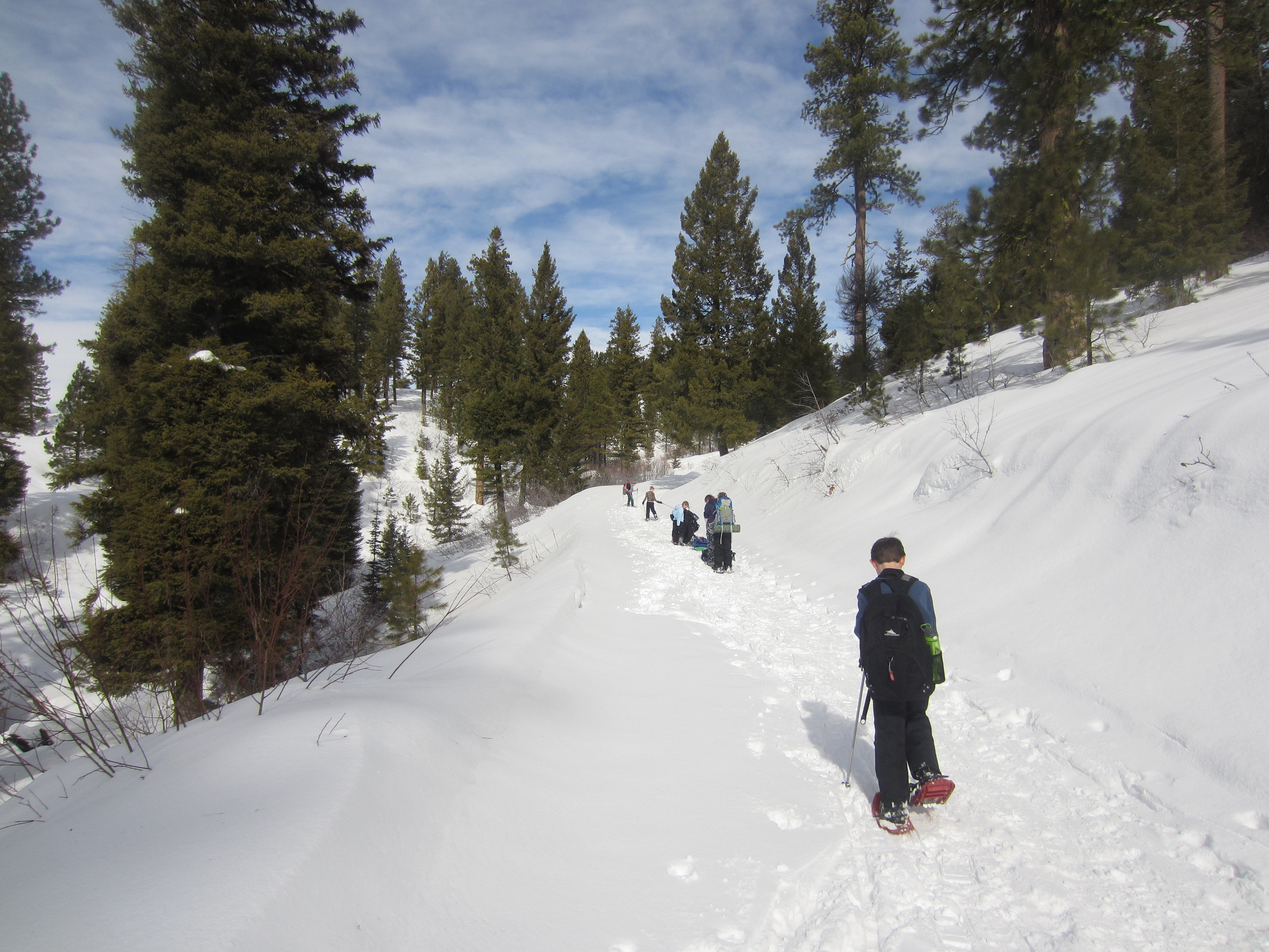 We saw a few smiles and dubious looks from others in the parking area as we loaded up 6 kids (ages 12 to 8) with snowshoes, sleds, and backpacks in some cases. The hike to the yurt is listed as 2 miles with about 750 feet of elevation gain.
