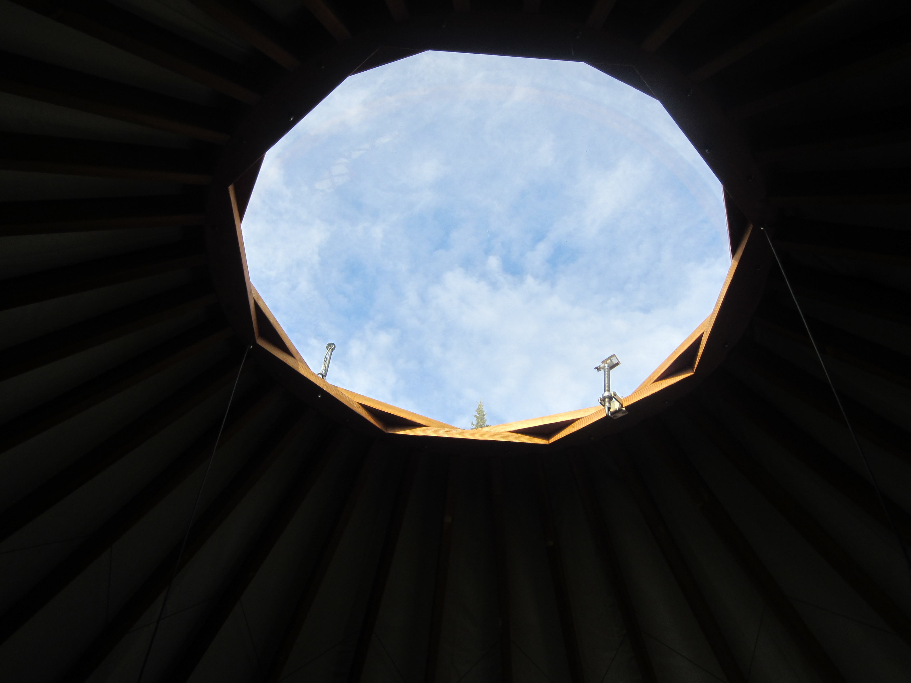 The yurt is stocked with dishes (we just used our typical backpacking set up), a two-burner stove that runs on the 1-lb Coleman propane bottles and a wonderful wood stove and skylight. It also has solar powered lights with an impressive battery system. When we walked in from our hike, it was about 70 degrees inside.